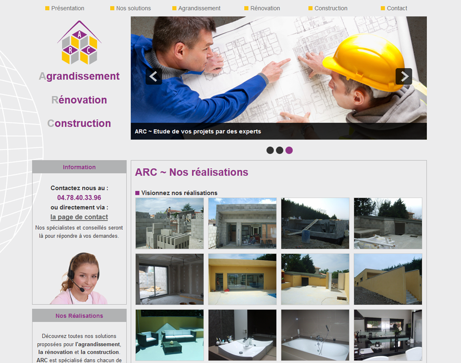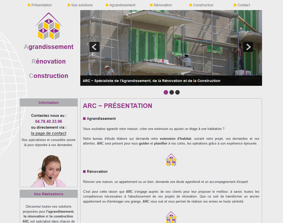 Réalisation complète du site de la société ARC - Agrandissement - Rénovation - Construction. Un site vitrine et de présentation de la société au couleur de l'entreprise ARC. Charte, développement et éléments commerciaux : cartes de visite, pochettes à rabats, flyers, e-mailing etc...