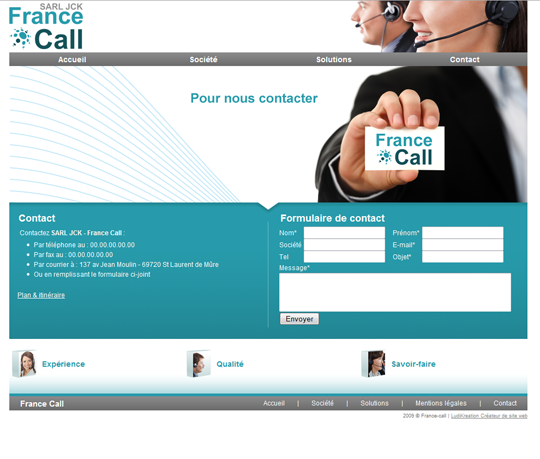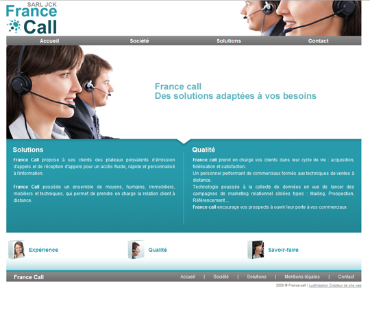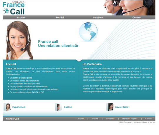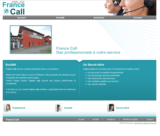 France Call est un site réalisé pour un call center où la structure est située en France. Un site de présentation propre et professionnel, afin de présenter un call-center sérieux et dynamique. Cette société implantée en France est créatrice d'emplois et permet d'être à proximité de ses clients. Un gage de qualité et de satisfaction.