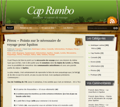 Cap Rumbo est un site qui aura pour vocation de rassembler tous les voyageurs, aventuriers et Globe-Trotters : Pour l'instant découvrez les aventures et les voyages d'un passionné, le site présente brièvement l'intérêt du site, mais l'activité principale actuelle se situe sur le blog. Premier voyage pour ce site, le Pérou et plus précisément Iquitos où le personnage part pour se rendre utile auprès des autochtones. Suivez de près son voyage qui sera commenté en temps réel, avec des photos et des vidéos.