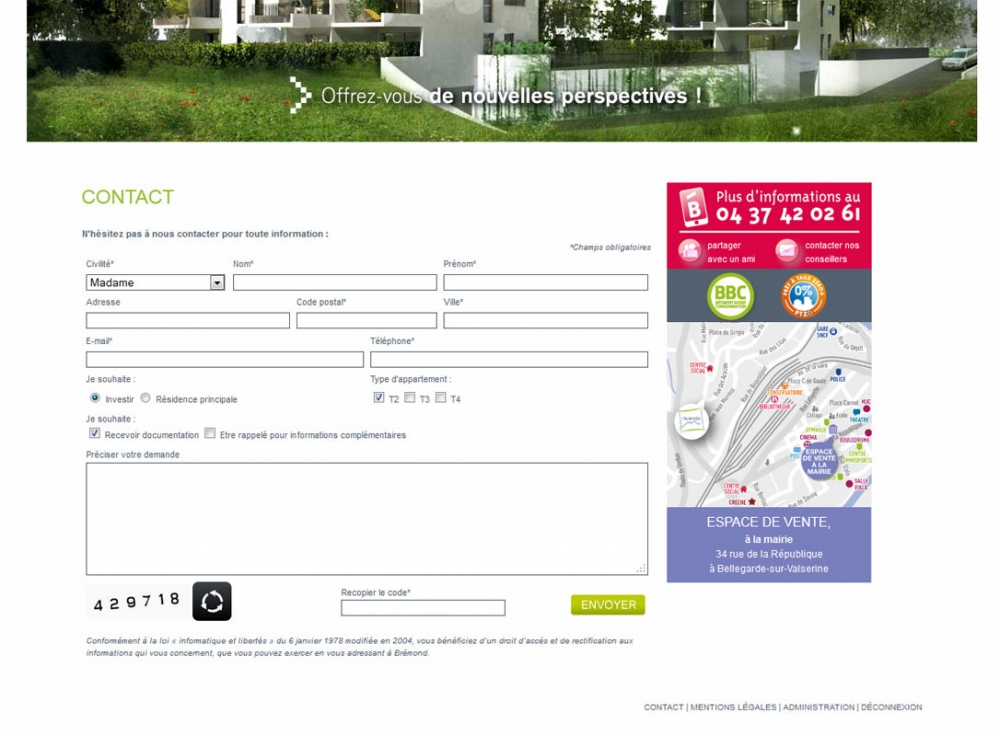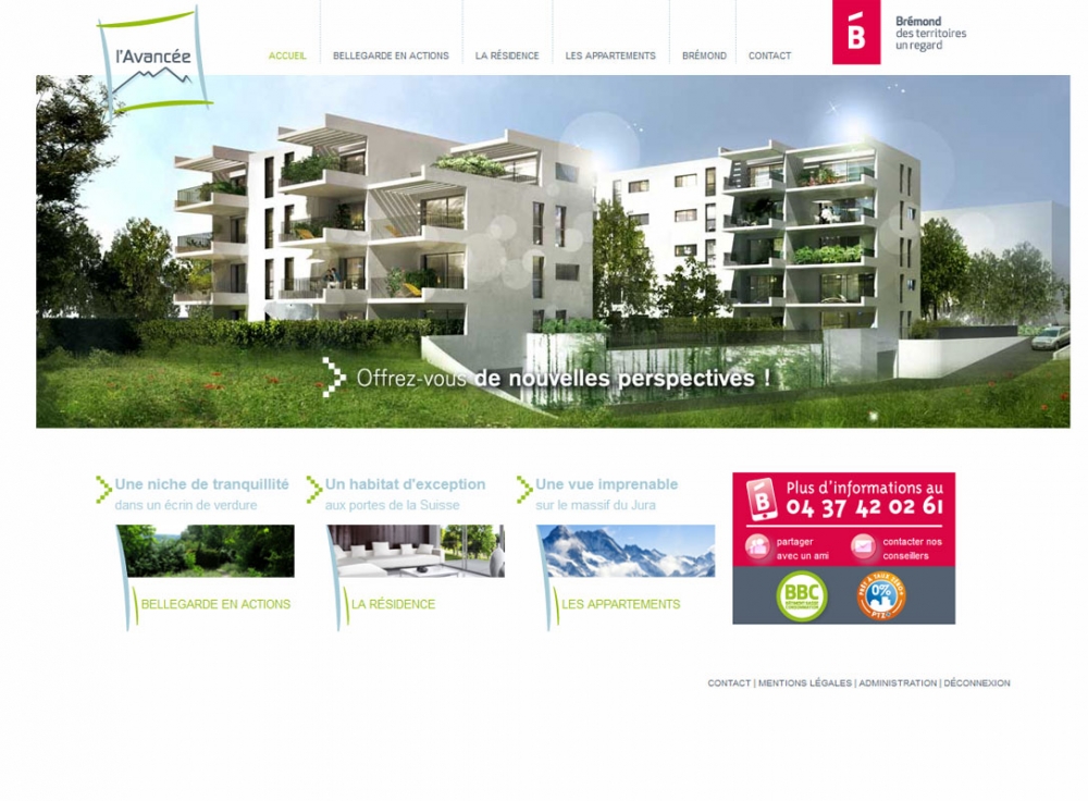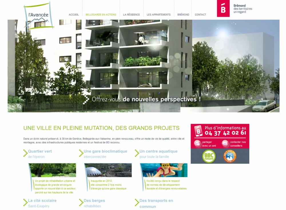 L'avancée est une résidence d'un projet immobilier qui propose des appartements neufs à Bellegarde-sur-Valserine. Des appartements neufs allant du T2 au T4 dans un cadre agréable entre ville et montagne, avec des infrastructures publiques modernes et un festival de BD reconnu. Le site web permet de se tenir informé du projet et d'investir dans l'immobilier. La page de contact permet de demander informations et documentation concernant la résidence l'avancée.