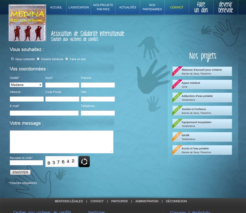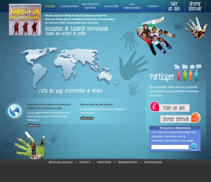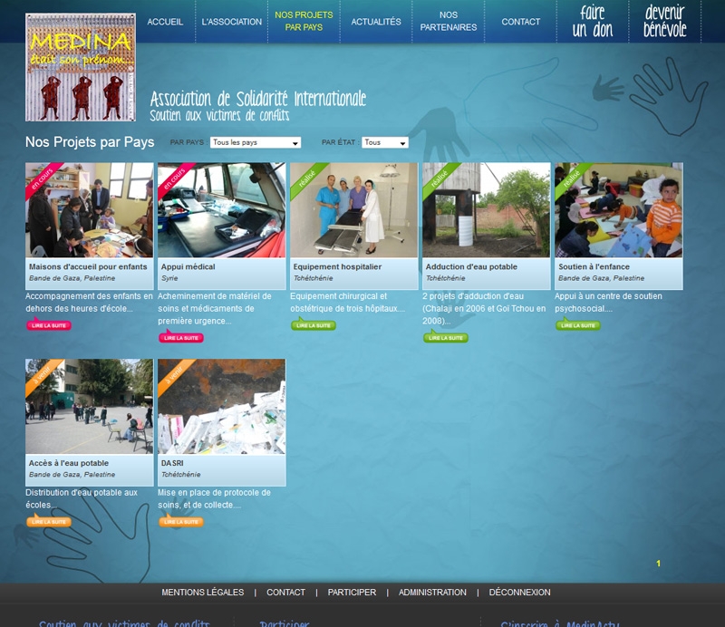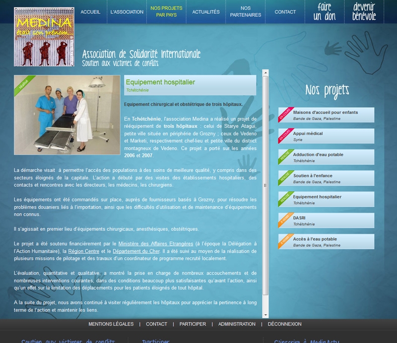 Site réalisé pour l'association Medina, qui intervient auprès des victimes civiles des conflits dans le monde. Le site permet à l'association de communiquer autour des projets et soutiens mis en œuvre par celle-ci.