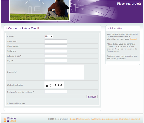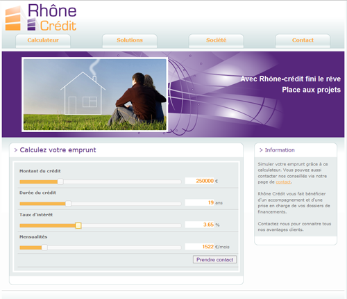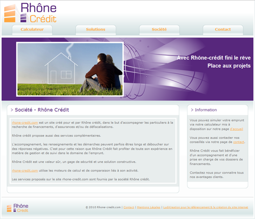 Rhône crédit, site d'experts en gestion de placements et plans de financements. Le site présente la société et toutes les solutions proposées par celle-ci. D'un graphisme accrocheur, le site est léger et adapté à Rhône Crédit. De plus un simulateur a été spécialement conçu pour le site et intégré à celui-ci. Il est ainsi à disposition des internautes, des futurs clients et des conseillers.