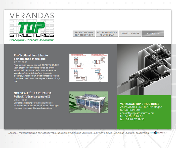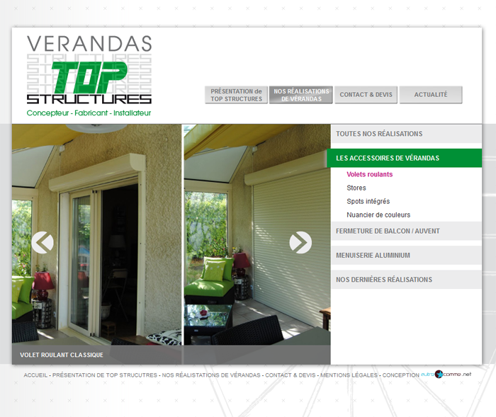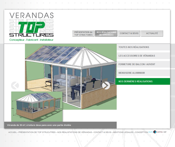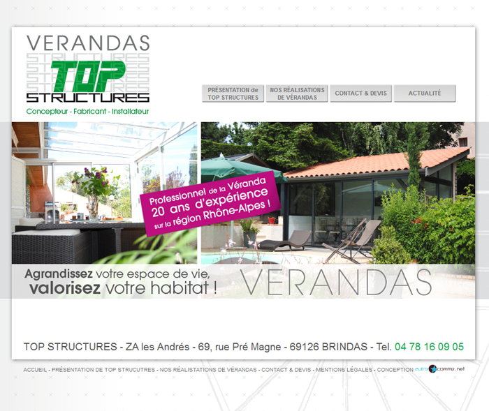 Conception technique du site internet de TOP STRUCTURES, spécialiste de la véranda. Conception d'un site vitrine sur-mesure, avec un graphisme proposé par l'agence AutreComme, ainsi qu'une mise en place d'une petite administration permettant de gérer actualités et dernières réalisations. Des éléments graphiques et d'animation ont été intégrés, tels que des menus déroulants et des slideshows permettant de faire défiler les images des réalisations de TOP STRUCTURES.